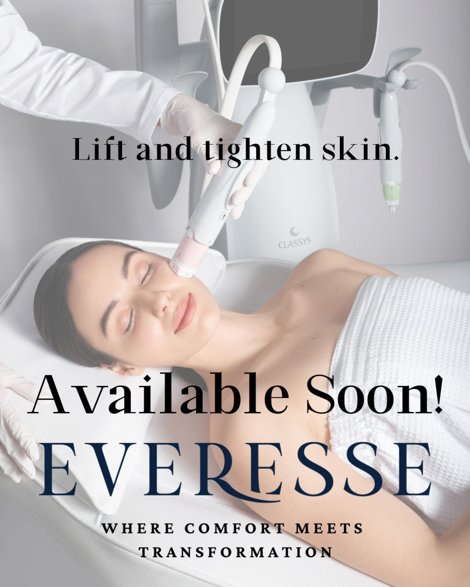 Available SOON! Our new EVERESSE uses radiofrequency, or RF, energy to stimulate collagen generation in the deeper layers of your skin. This helps combat the laxity and loss of volume that can happen as we age. EVERESSE can be used on the face, neck and around the eyes for visible lifting and tightening. No numbing, no pain and no downtime.